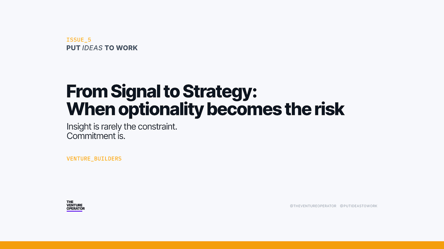 Under startup and venture settings, identifying meaningful signals early is essential. These signals are tested and refined, with evidence strengthening some options while eliminating others. Yet the move from recognition to action frequently stalls, not because the signal is weak, but because acting on it requires narrowing options.
